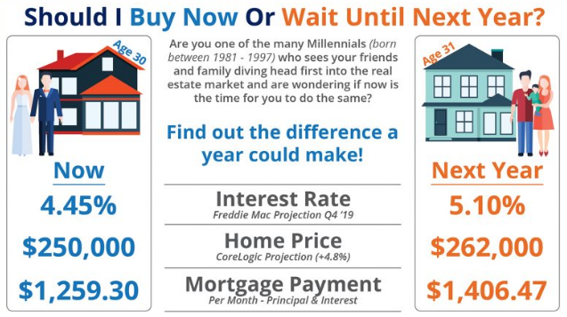 01/21/2019: Can Waiting to Buy Your Next Home Actually Cost You More Money? Good news...this one's an easy one! Let's look at the facts. What makes up "cost" when it comes to buying a home? 2 things...price of the home and interest rate on the mortgage make up the cost to you of owning a home (excluding of course taxes and maintaining the property). Now, nothing is guaranteed but based on history and what we know about the market today, it's a pretty good bet to expect both home prices and mortgage rates to increase over the next year.