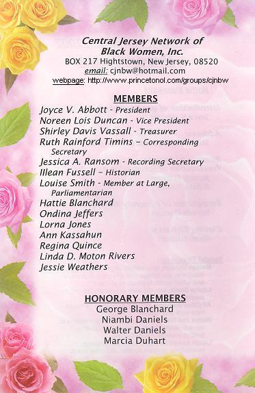 Special Thanks to: Noreen Duncan, who worked diligently over many months as our college contact person to promote and follow up the applications process. Louise Smith, who did another splendid job with the decorations. All Other Members of CJNBW for their continued hard work and support. Walter and Niambi Daniels for their contributions to our scholarship funds in memory of CJNBW founding member, Gloria Daniels. Liston Abbott for support with our webpage, newsletters, program booklet, and other needs.