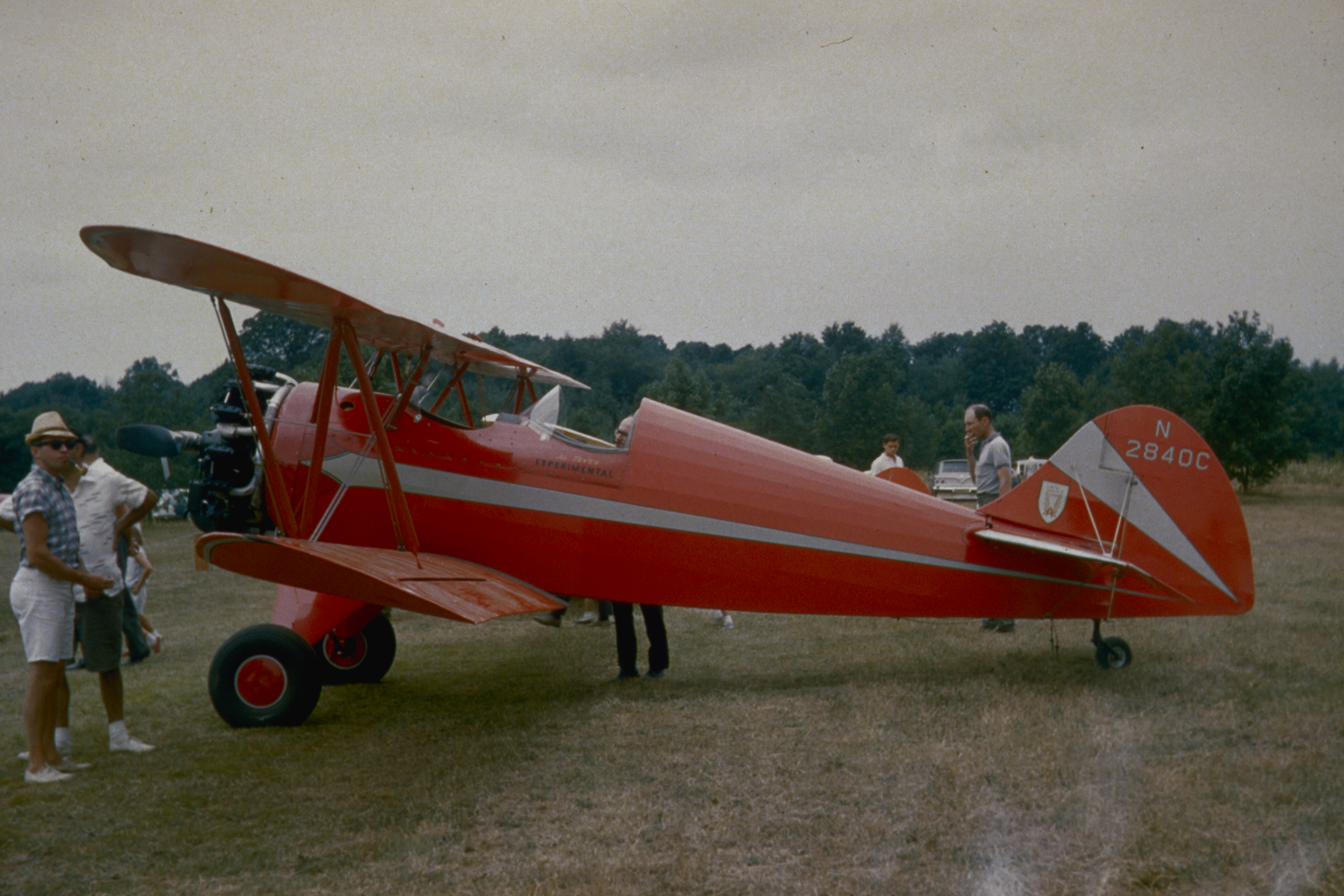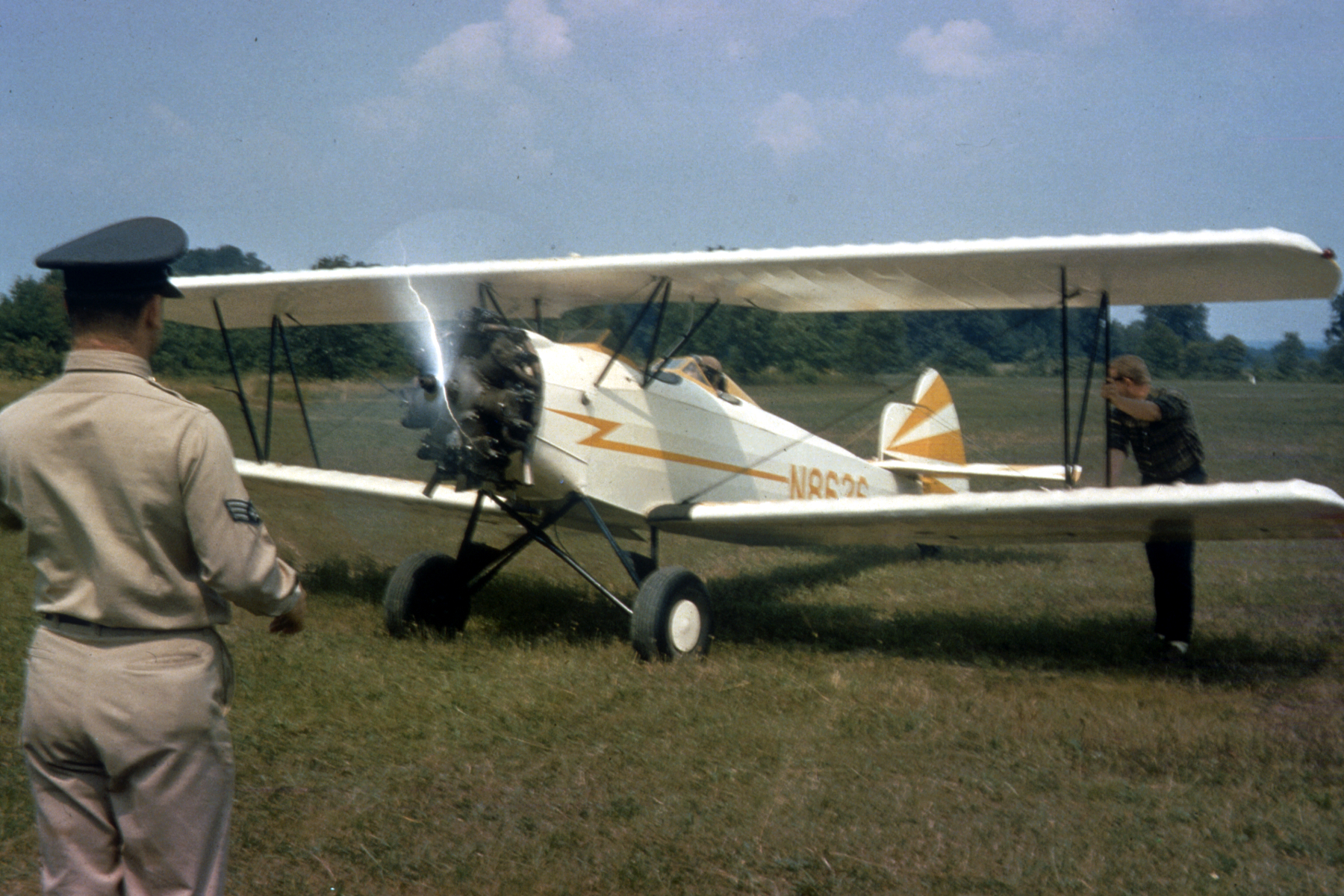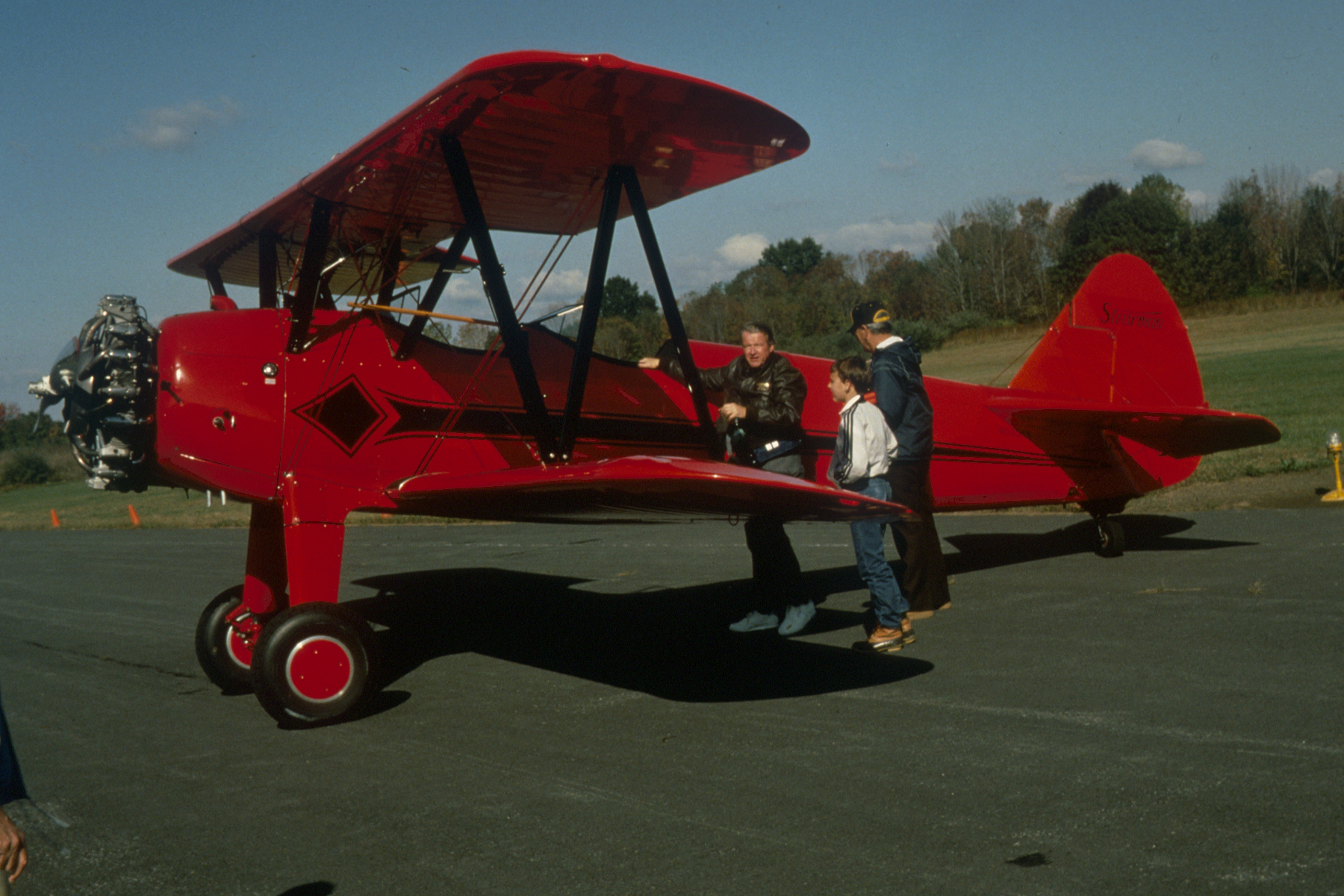 279. Harry Askey explaining some of the details of his 450 Stearman to admirers at Martin State Airport, Baltimore, MD.