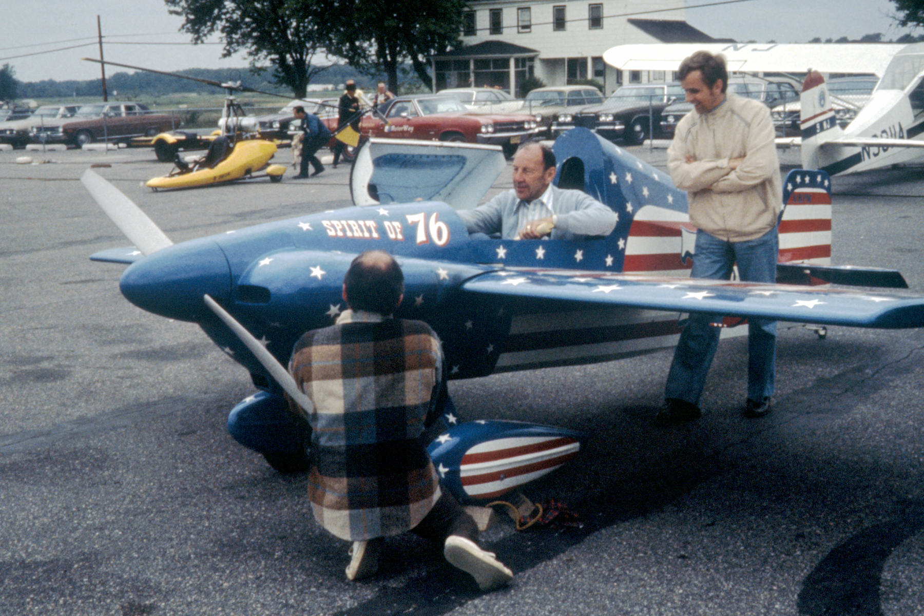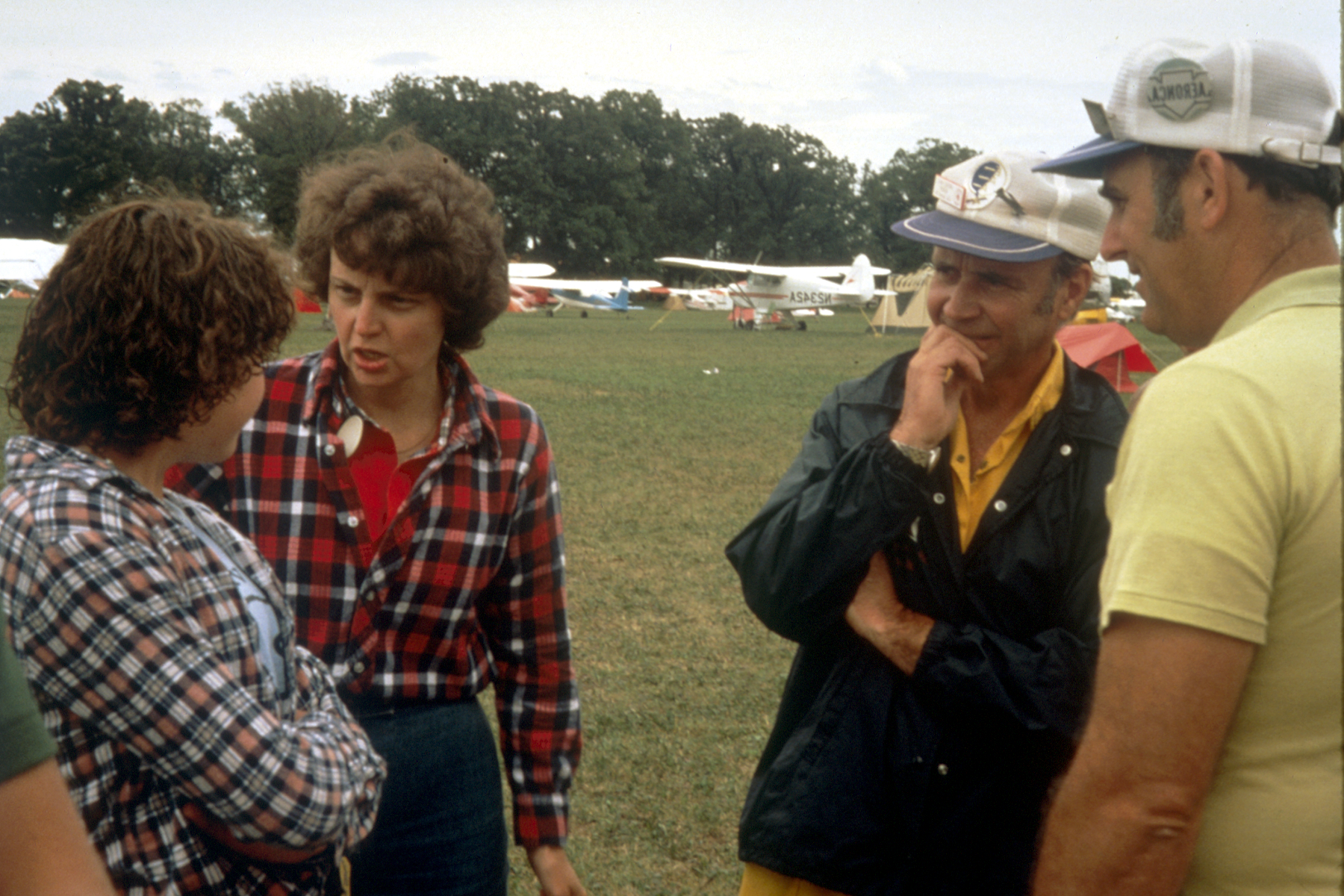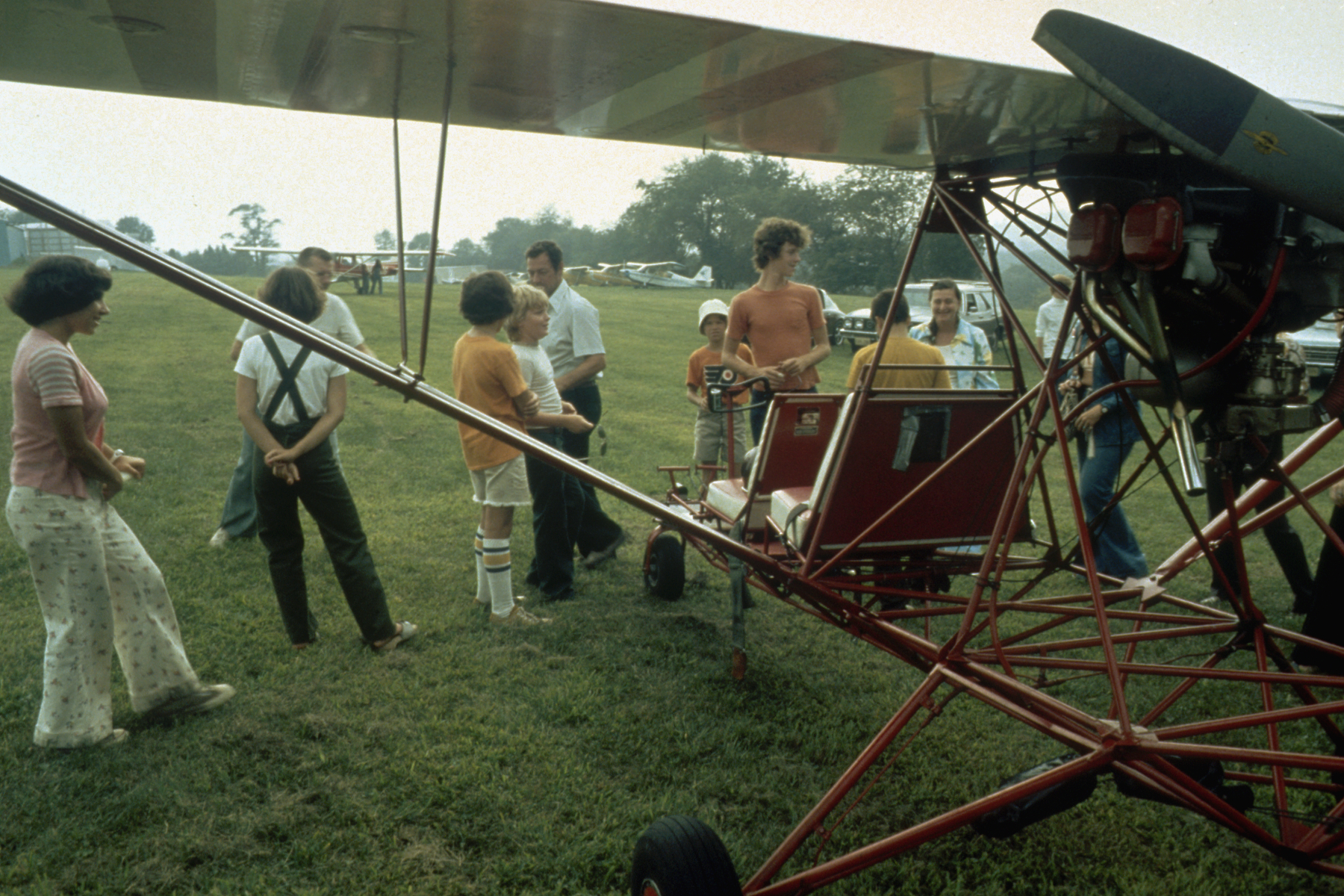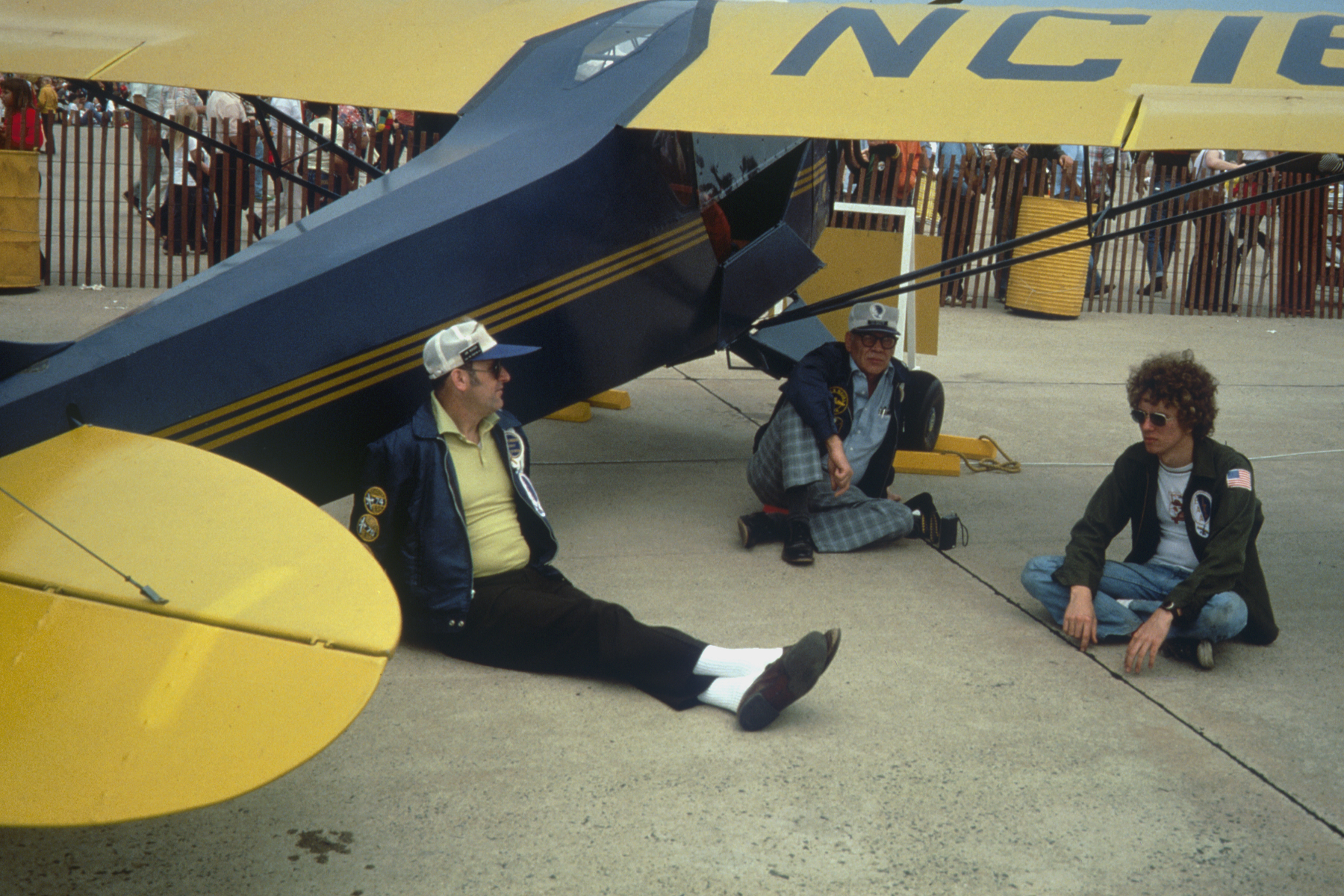 224. Dave Kellner (sunglasses) give the crowd a close-up look at Paul Musso’s Real Sporty. The crowds were drawn by the fact that they could purchase a model kit of the airplane they were looking at.