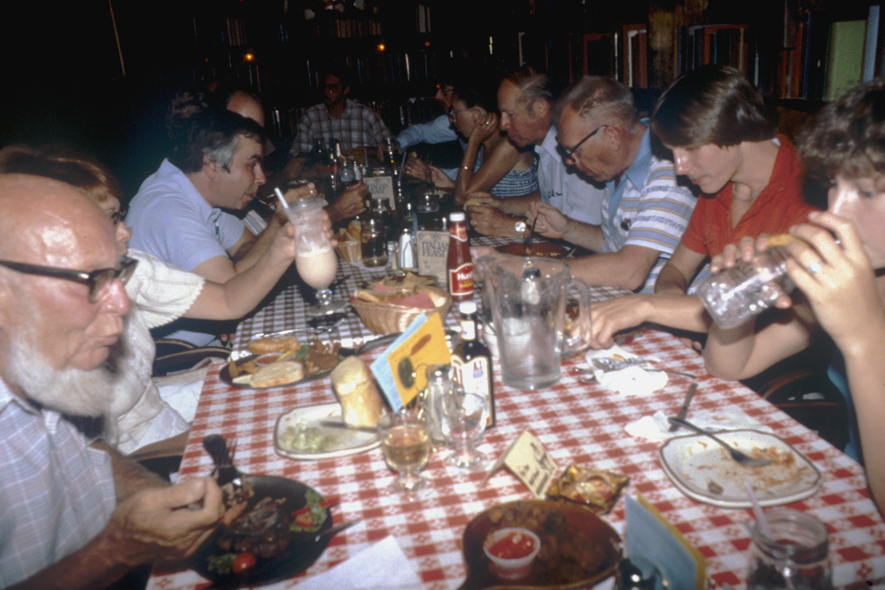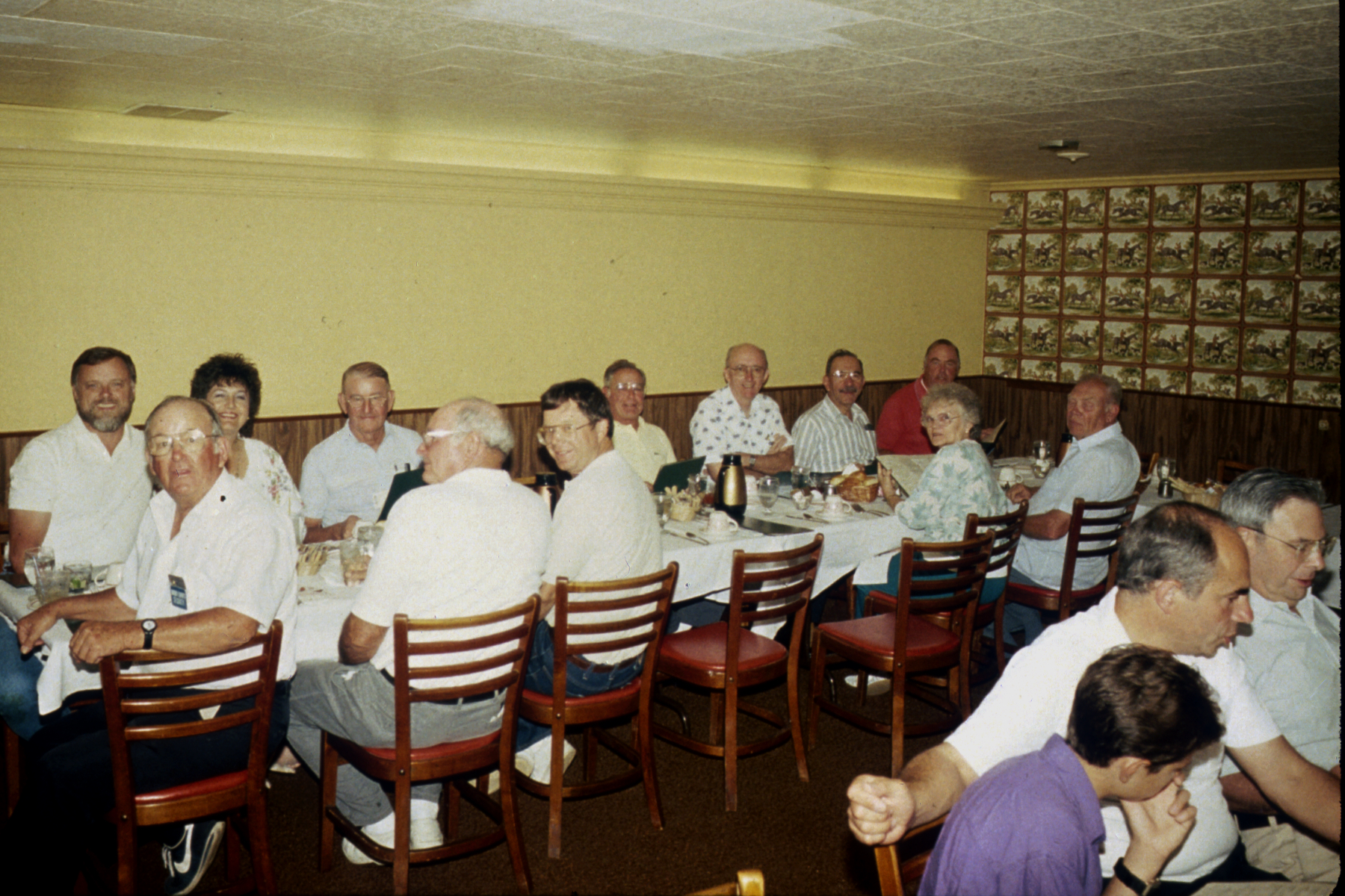 40. In downtown Oshkosh Baxter’s hosted several of our chapter dinners. Here we can see Ken and Linda Roberts, Jim Beaumont hidden behind Linda, Dick Behrmann, Andy, Mildred Sally and Arnold Hohl, Keith Caulton, unknown, Charlie Schrey’s friend and Charlie, Joe Wieger, Lee Weiss (facing opposite), Betsy Jackson (hidden) and Steve Jackson.
