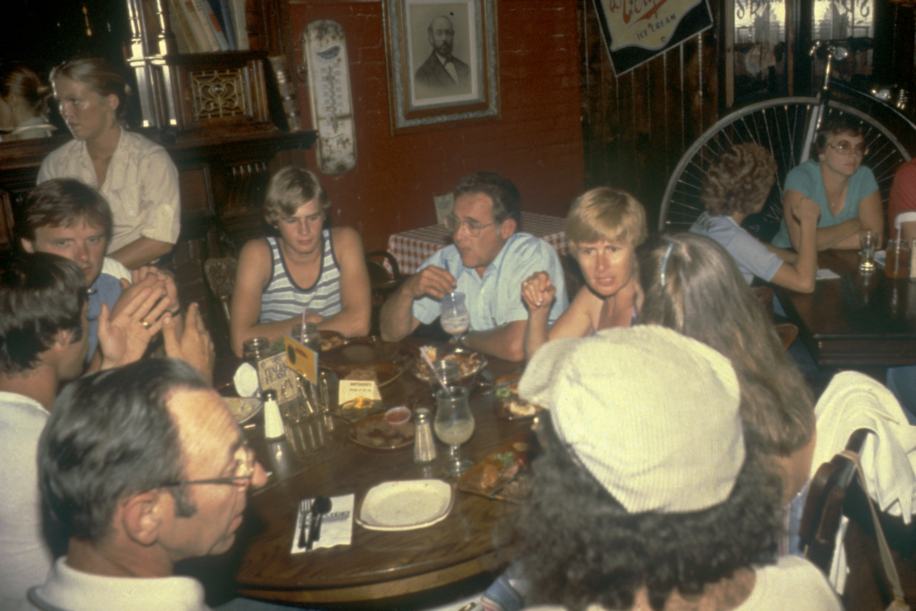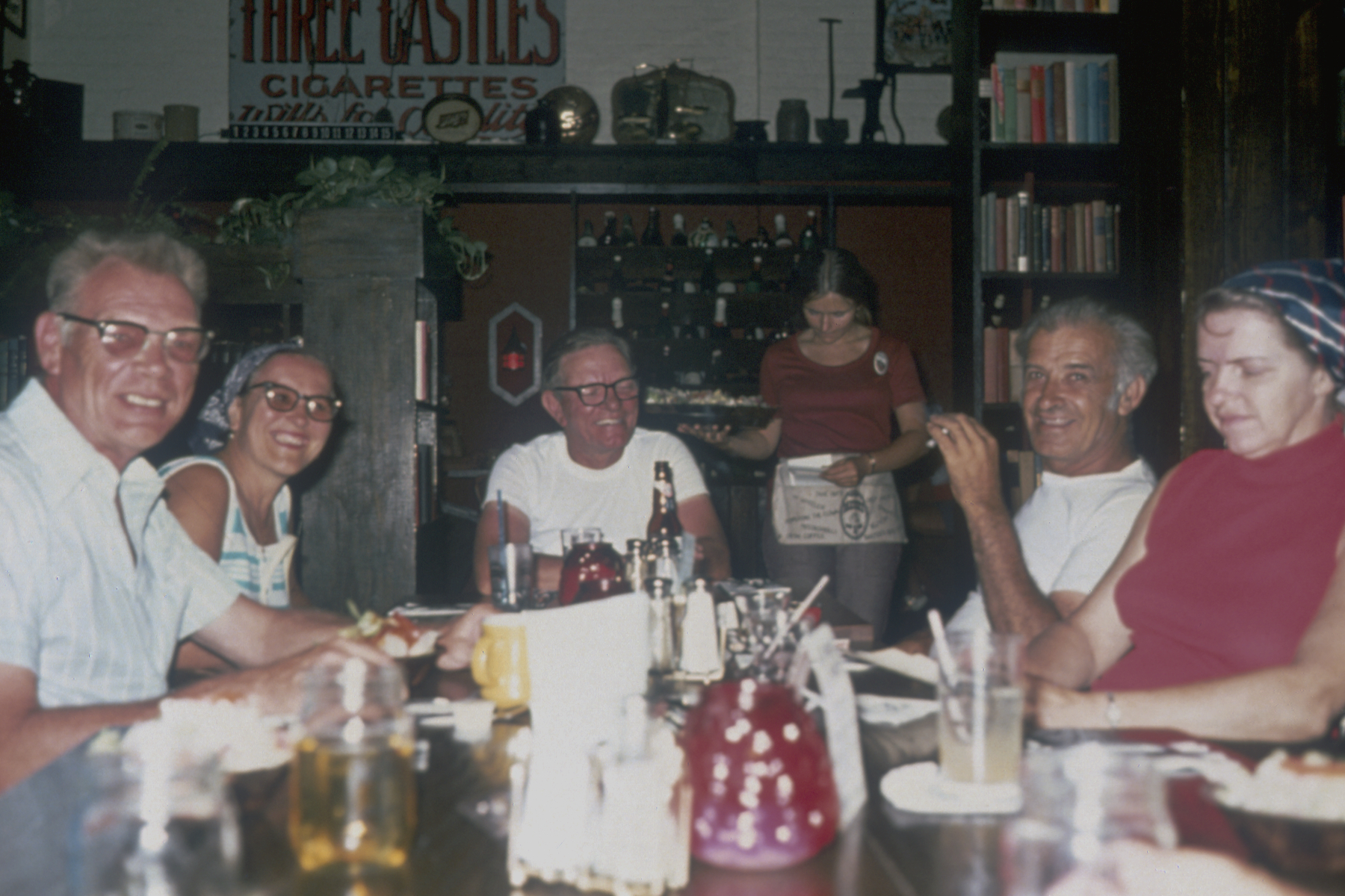 43. We’re still at Baxter’s. Dick Behrman is facing the camera and clockwise are unknown, unknown, Joe Wieger, Arnold Hohl, Sally Hohl, Suzy Wieger’s friend Jennifer, and Suzy Wieger.