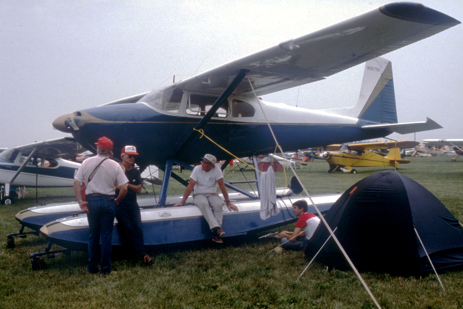 76. Charley Byron sits on the float of his Cessna 180 while camping in the classic area at Oshkosh. Joe Dunbar is forward of Charley on the float.