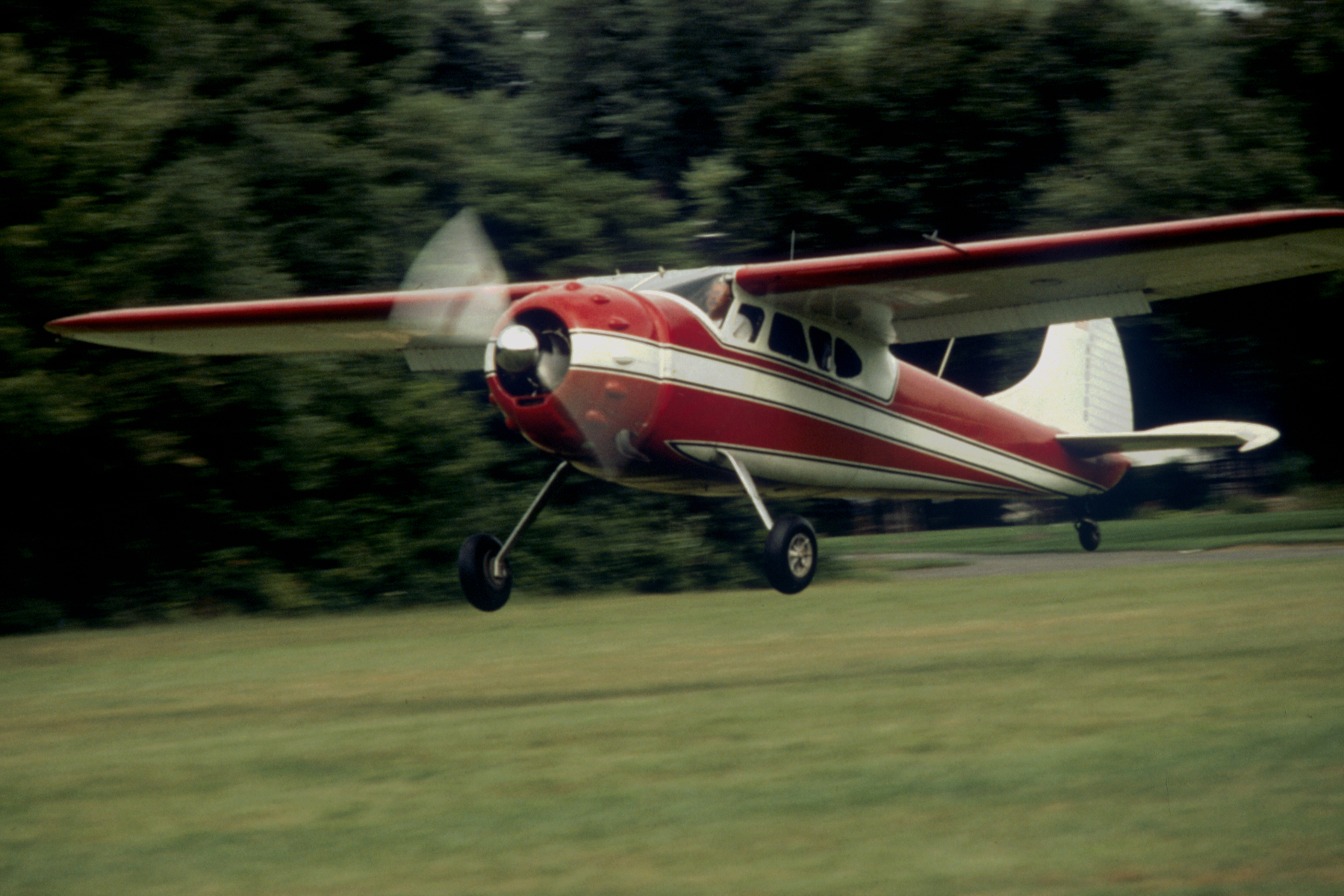 79. Harry Askey brings his newly acquired Cessna 195 in for a landing at Twin Pine.