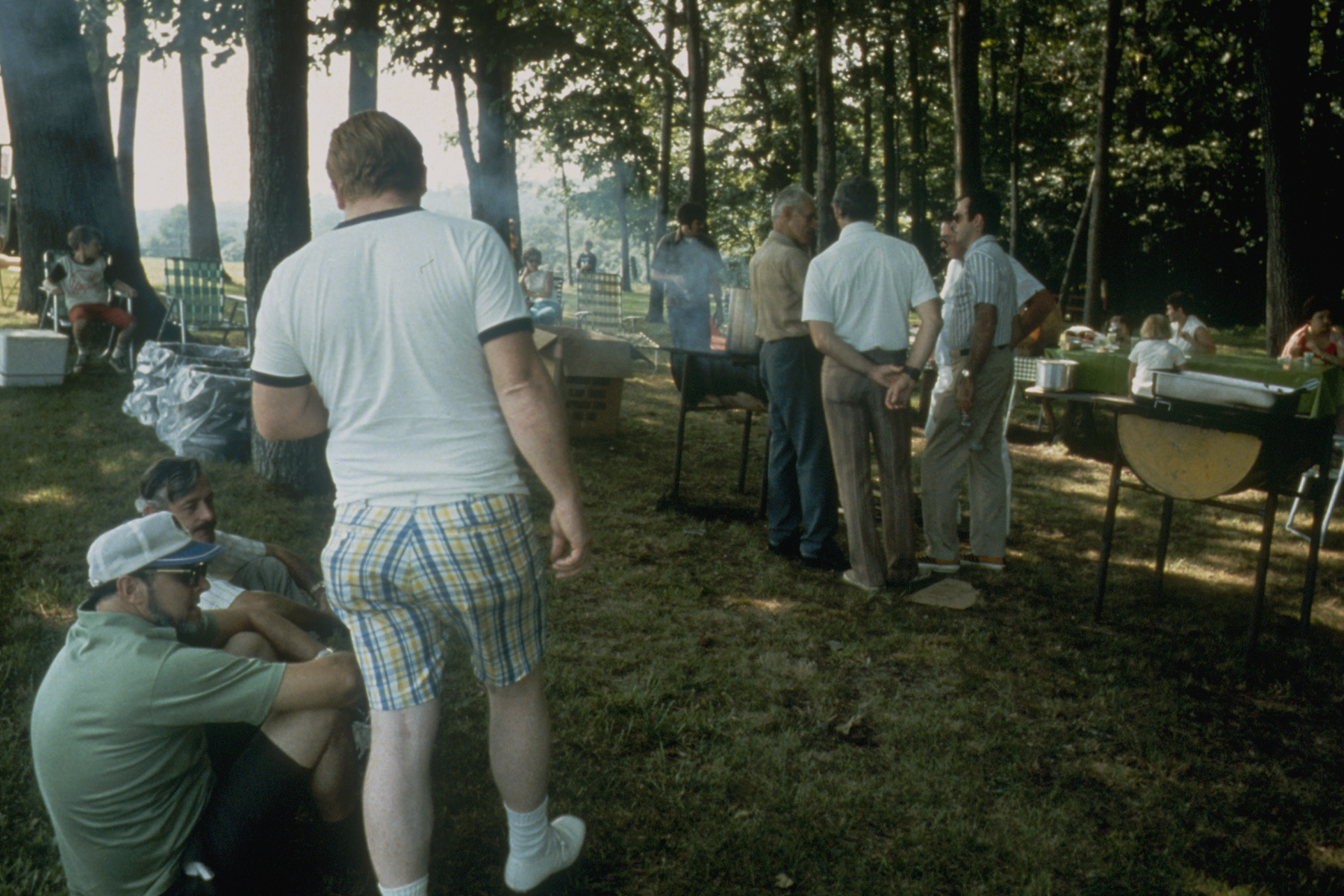 80. Frank Pearce and Fred Siegel are seated under the tree, and Joe Naphas is walking toward the grill in this picture of an early chapter picnic at Twin Pine.