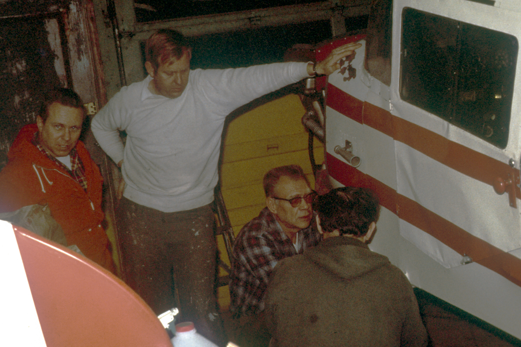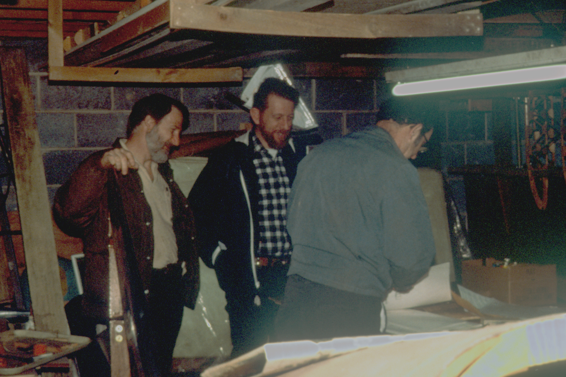 90. Dave Kellner, center, and fellow aircraft owner Hal visit Joe Wieger’s basement workshop in the Polliwagen days.