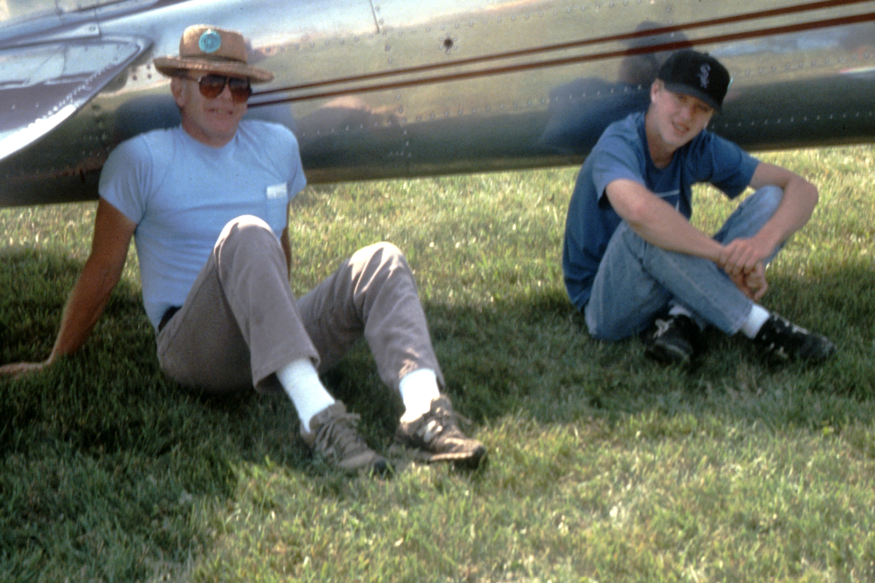 91. Ed Flynn and Spencer Robertson found some shade under a Cessna 195 while watching the airshow at Oshkosh.