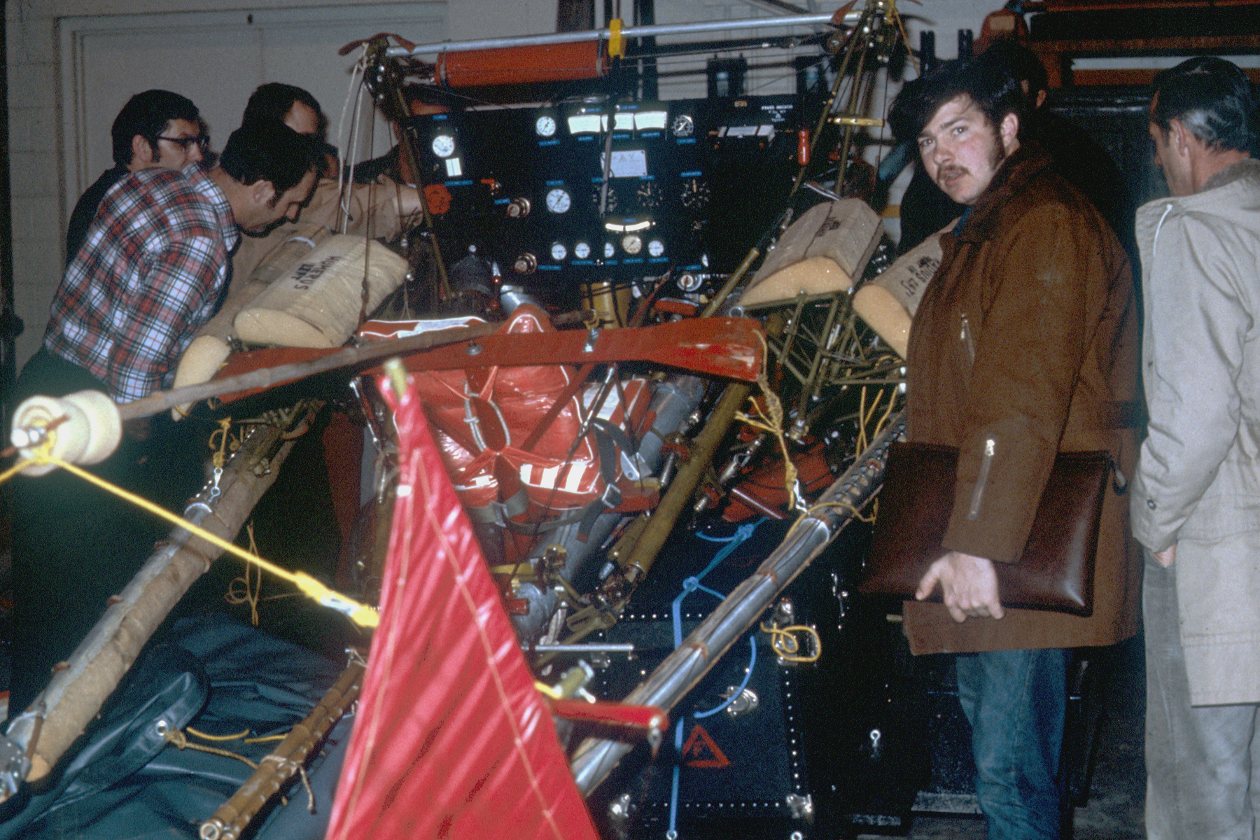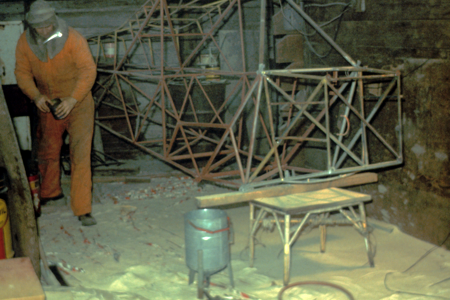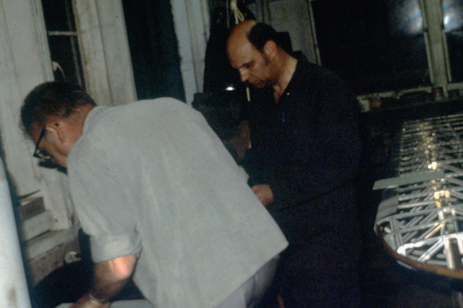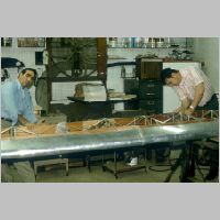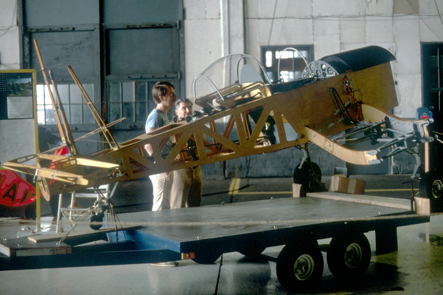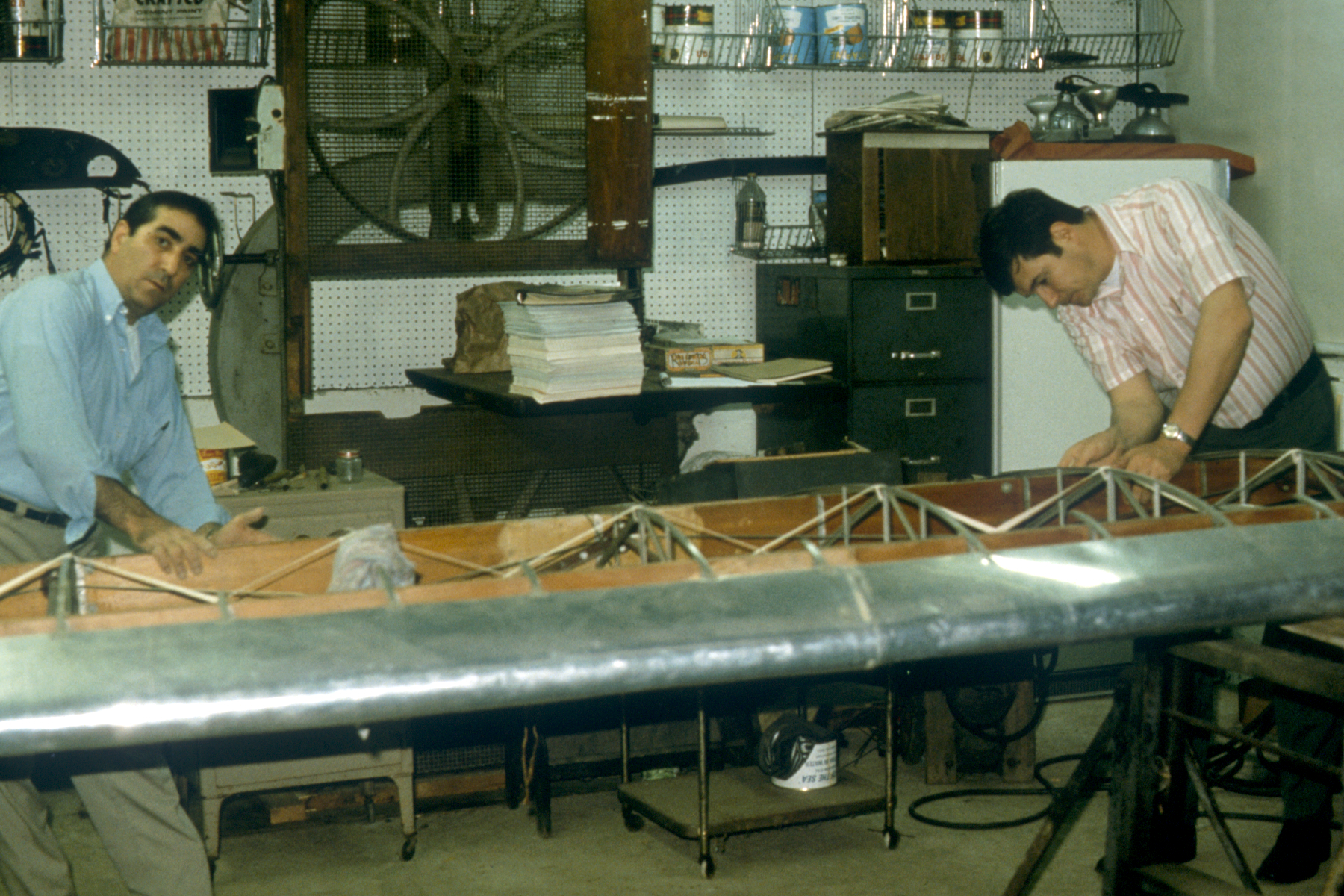 39. Joe Wieger and Andy Moscarelli are examining the construction of the main spar for Andy’s Polliwagen.