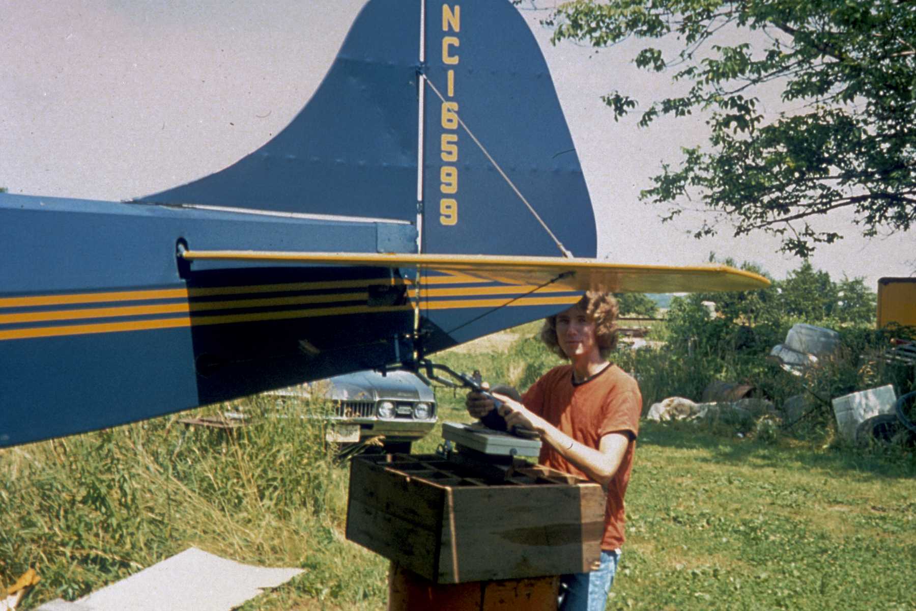 202. Larry Weeks and Frank Liberti repaired Larry’s wind-damaged Piper PA-12 in John Warren’s barn. Larry is shown just before getting the airplane back into the air.