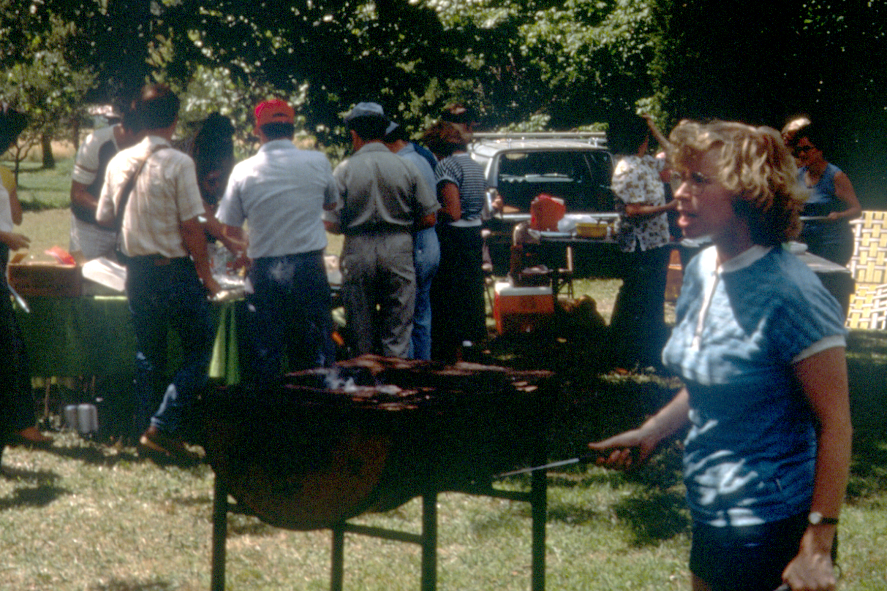196. Betsy Jackson flips burgers at a Twin Pine picnic.