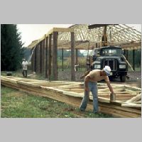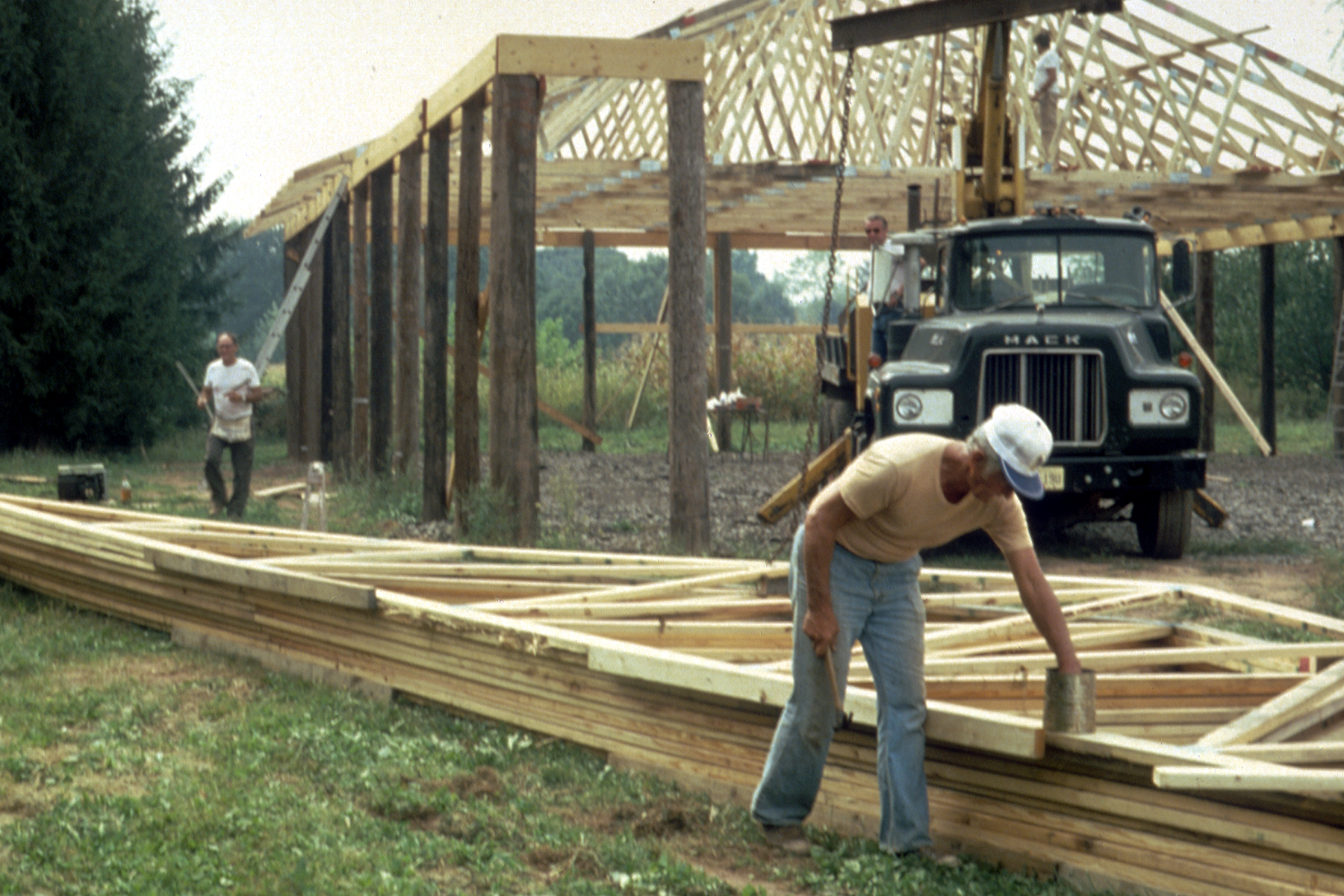 207. Joe Wieger and John Prokop prepare the roof trusses while Jim Course operates the crane and Ralph Bodenweiser guides the trusses into place.