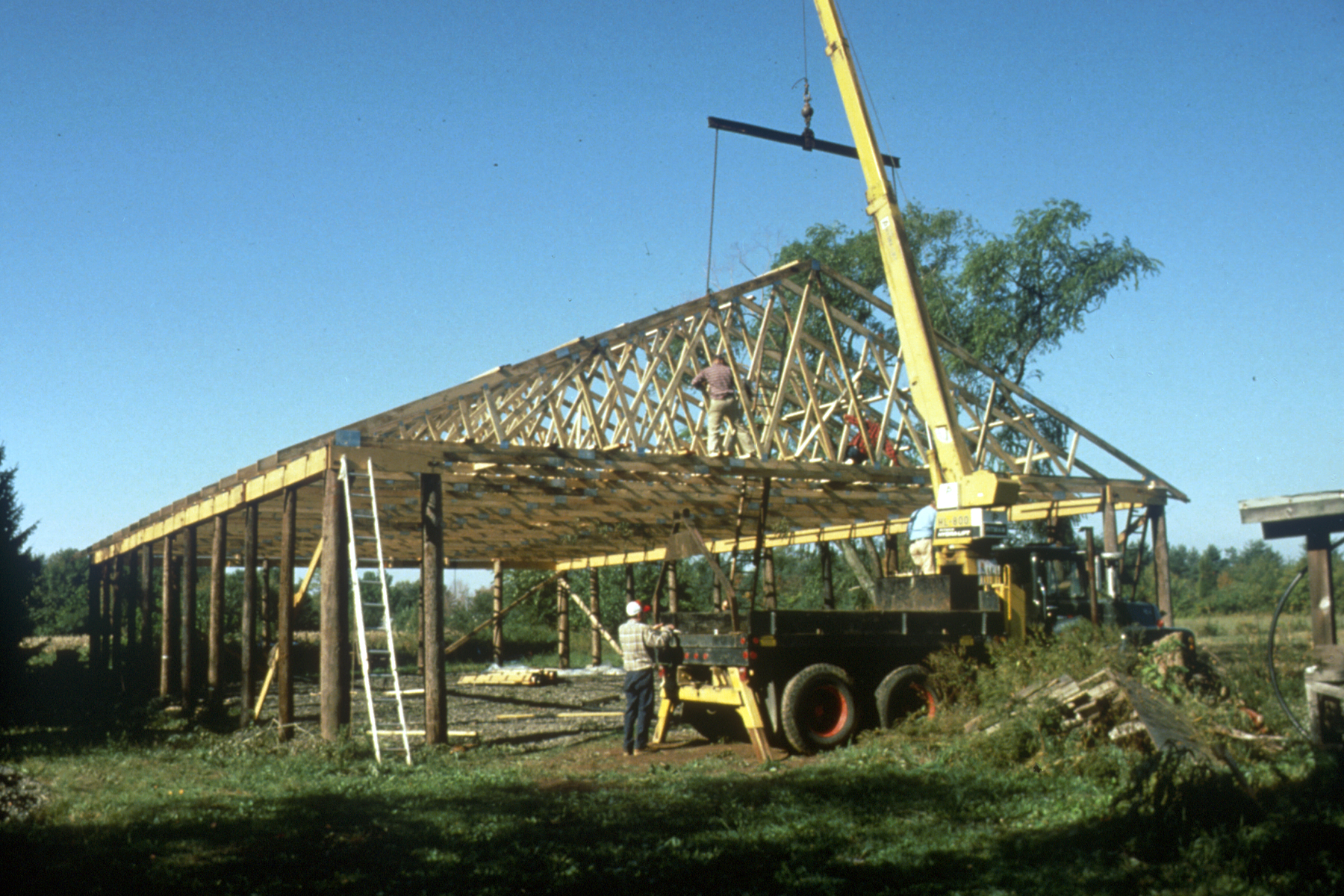 212. Andy Moscarelli, Jr. and Joe Wieger about to install roof trusses on the chapter’s pole barn.