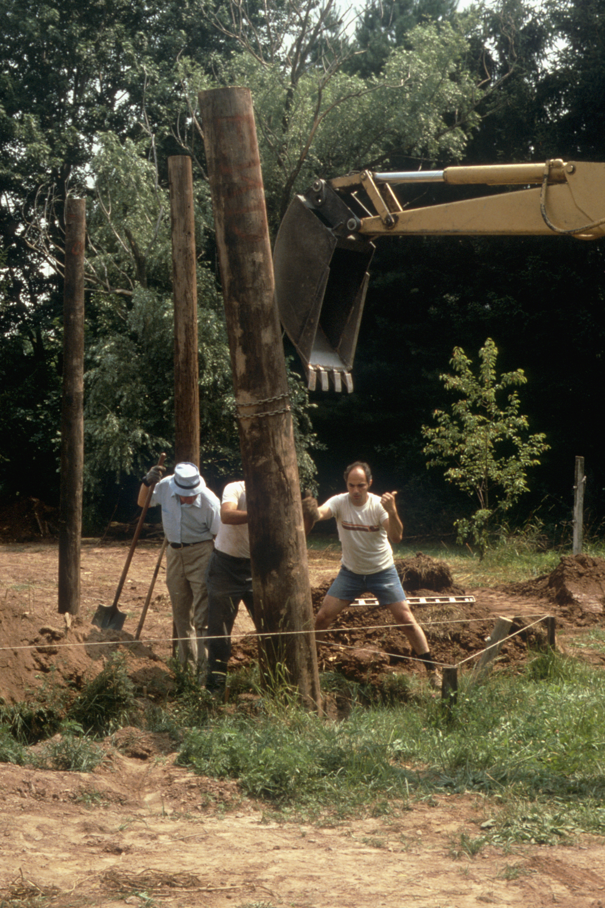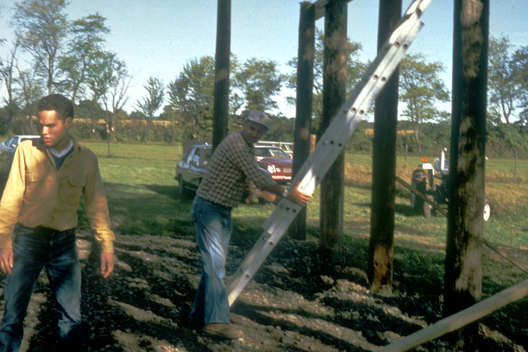 217. Ralph Bodenweiser runs the front end loader to fill in around the poles while Joe Raimondo, Joe Wieger and Jim Beaumont do the grunt work of smearing on the preservative and tamping down the area around each pole.