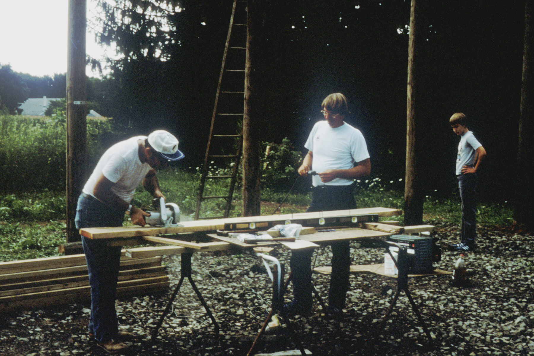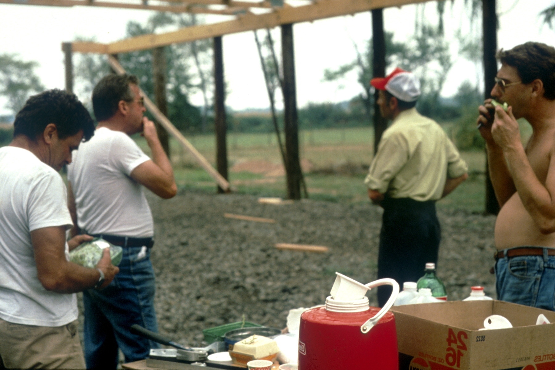 216. Ralph Bodenweiser, Jim Course, Andy Moscarelli and Gary Burns take time out during construction of the pole barn.