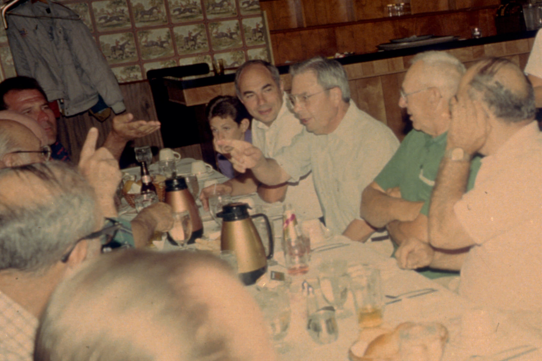 228. Dinner at Robbins in Oshkosh included unknown, Joe Wieger (glasses), unknown, unknown, Jim Kaiser, Joe Raimondo and Joe Jr., Sam Calaby, Don Ruffner and unknown.