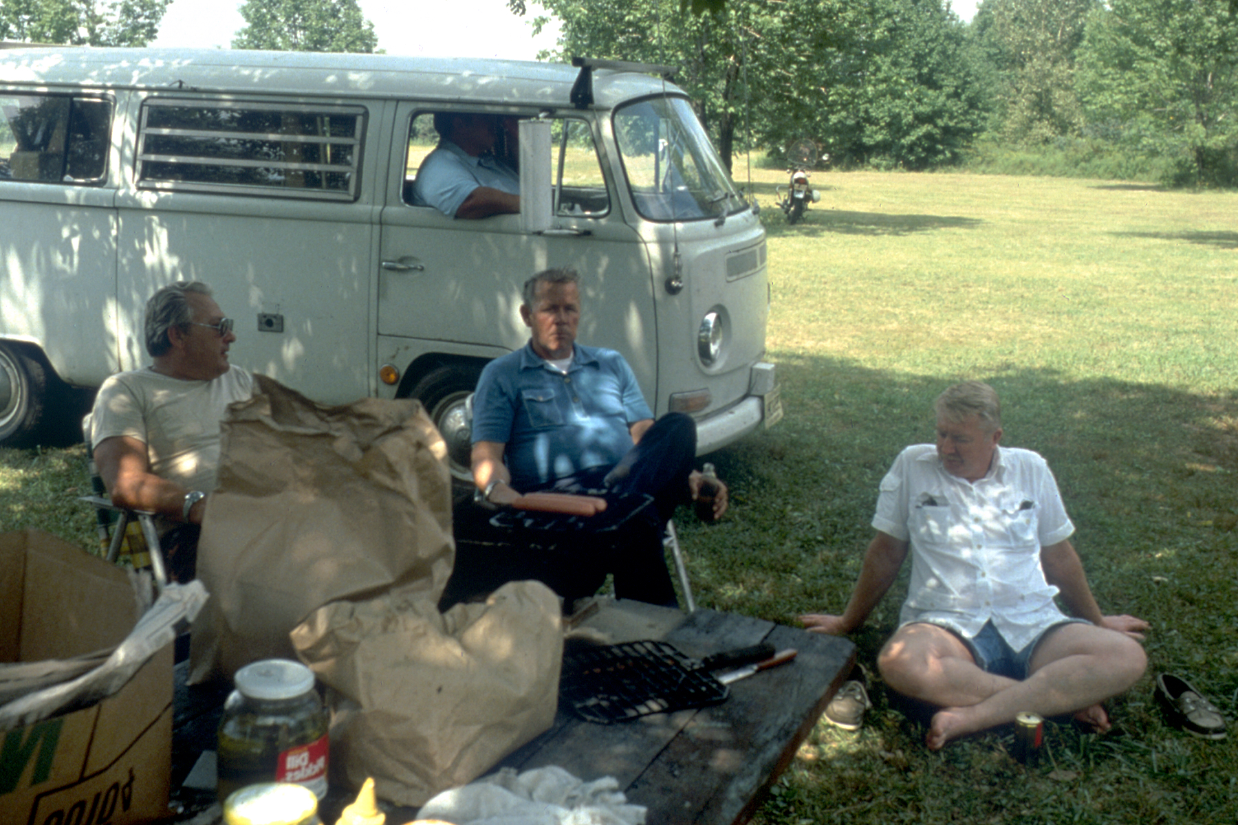 189. In the Oshkosh classic camping area Mildred, Sally, and Arnold Hohl discuss the previous night’s rainstorm with Joe Wieger.