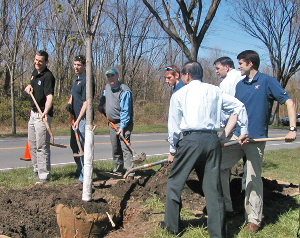 LOCAL GROUPS AND VOLUNTEERS GATHER TO PLANT PRINCETON ELMS IN THE WASHINGTON ROAD ELM ALLÉERoger Holloway, who grows Princeton Elms at his Atlanta nursery , Riveredge Farms, said replanting trees such as the Princeton Elm has more than just a sentimental benefit, however. "It's very important, especially considering all the foreign diseases coming in affecting trees," he said, mentioning Sudden Oak Death disease, Bacterial Leaf Scorch, the Asian Longhorn Beetle, and the Emerald Ash Borer as all having contributed to the demise of millions of trees. This is why, Mr. Holloway said, resistant strains of trees need to be identified and propagated. Riveredge Farms donated the trees that were planted last week. He also noted that some Home Depot stores are now stocking the Princeton Elms, specifically the store in Hamilton/Robbinsville. |